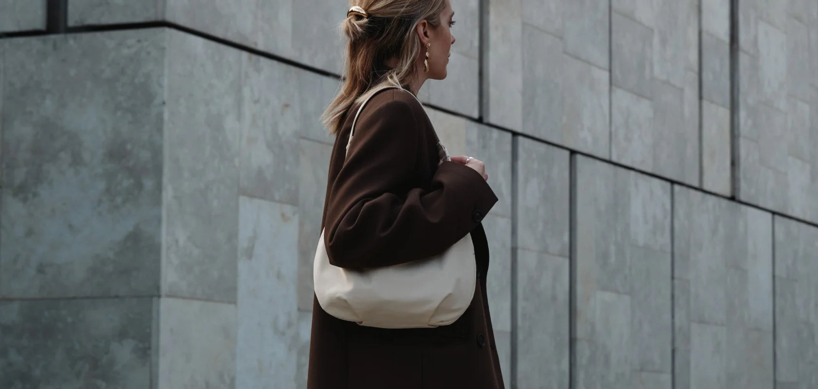 Woman wearing a brown coat with a Lo & Sons white Aoyama bag standing in front of a gray wall