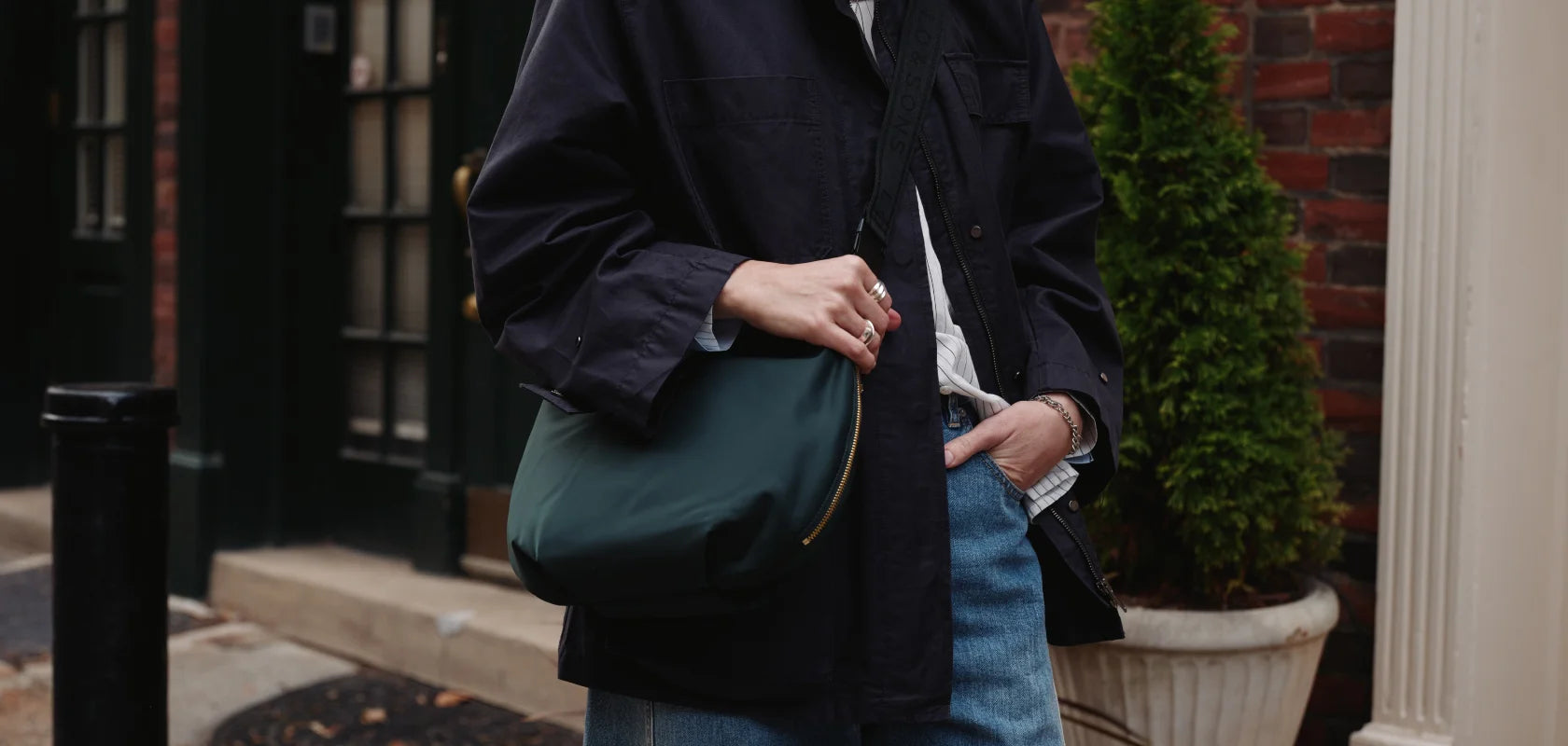 A premium quality, sustainable water-resistant and PFAS free nylon provides a sturdy and chic exterior.